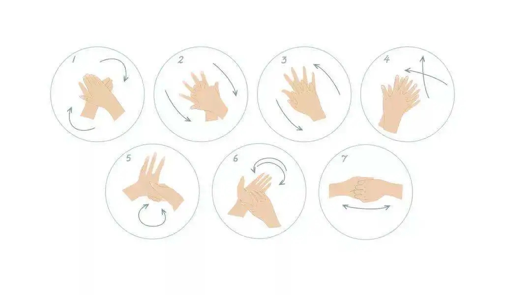 02保持手部衛(wèi)生。接觸公共環(huán)境或公共用品后,用肥皂或洗手液,采用七步洗手法搓洗,流水沖凈。如沒(méi)有洗手設(shè)施,可使用含有70%至80%的酒精搓手液(免洗洗手液)潔凈雙手。
