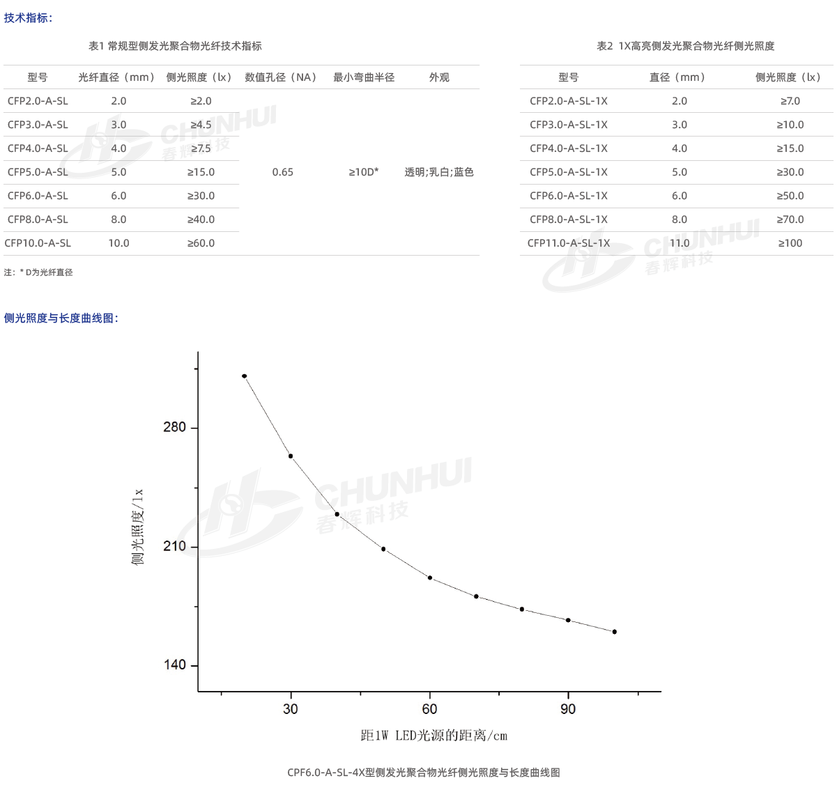 在波長650nm處, 常規(guī)型側(cè)發(fā)光聚合物光纖每米透光率大于90%以上,導光距離可達40m;